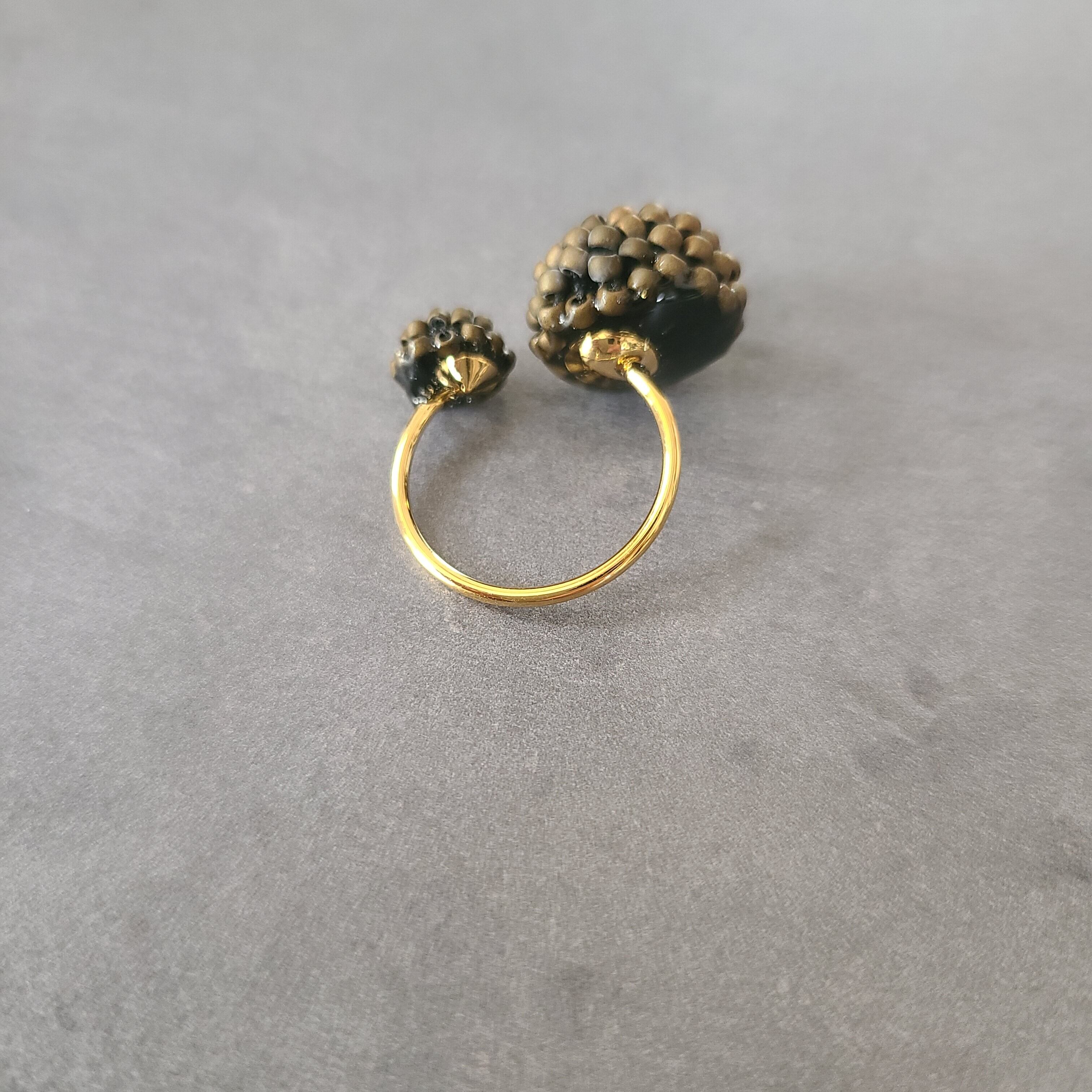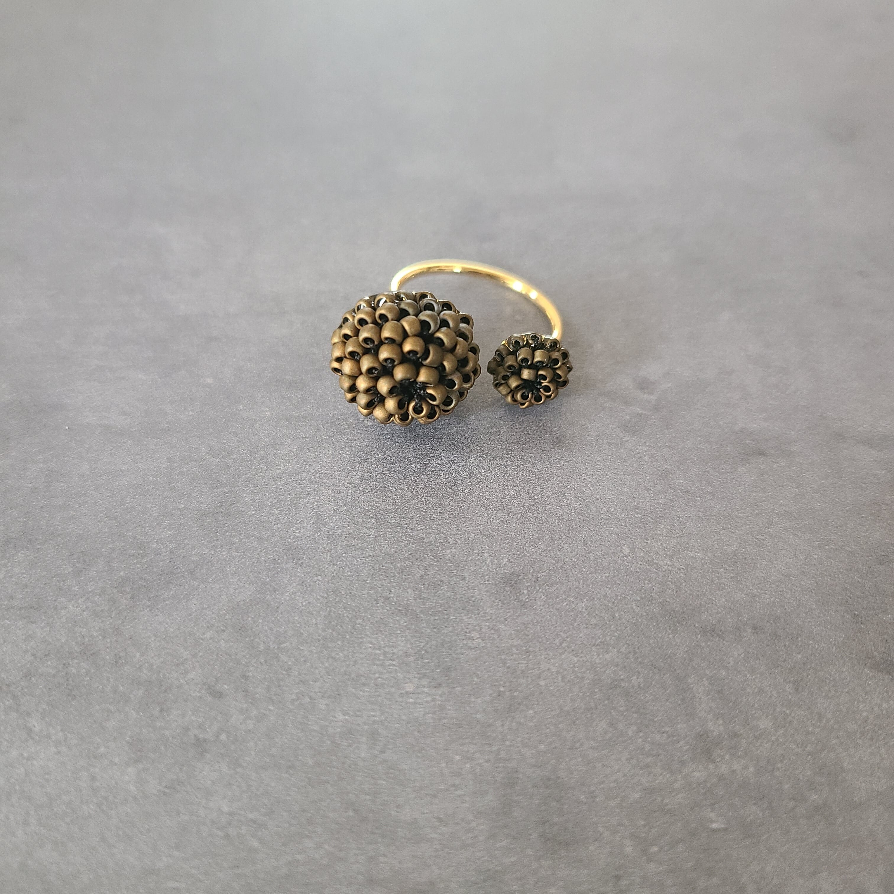 直径15ミリと10ミリのつぶつぶモチーフのリングです。フォークリングですのでリングsizeは11号ですが、フリーサイズとしてお使いいただけます。